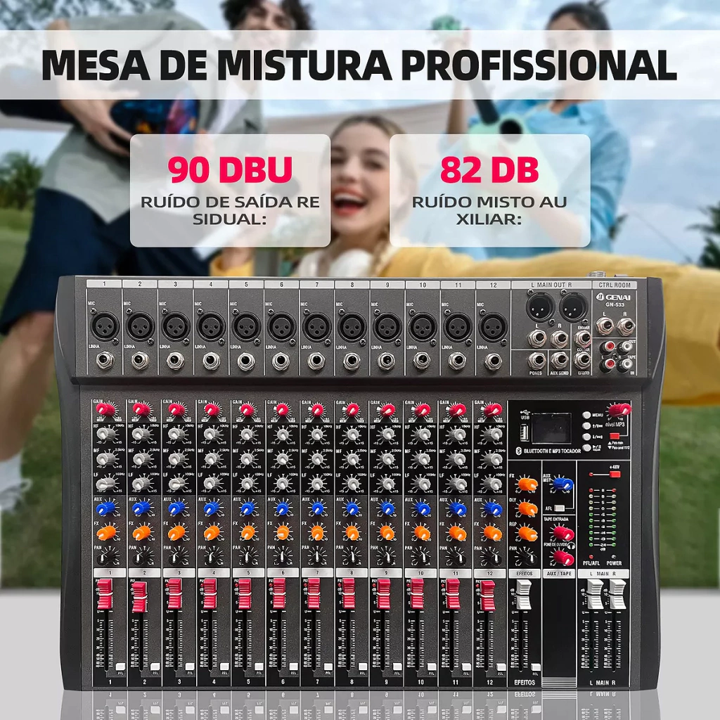 Transforme suas produções e eventos com a Mesa de Som 12 Canais Bluetooth Com Alimentação Fantasma da iiGenai. Garanta controle total e som de alta fidelidade em cada detalhe, elevando o nível do seu áudio profissionalmente!
